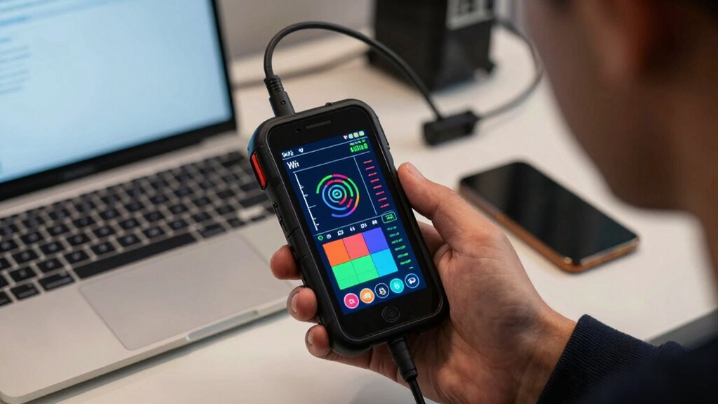 When you’re beginning Wi-Fi testing, understanding which metrics matter most can seem overwhelming. Focus first on Wi-Fi security, guaranteeing your network is protected from unauthorized access. Look for metrics related to encryption standards and network vulnerabilities. Next, consider device compatibility—your network should support all your devices smoothly, without connection issues. Additionally, if you plan to host outdoor gatherings, ensuring your Wi-Fi can support multiple connected devices will enhance your party experience. Check signal stability and transfer speeds to gauge performance, but don’t overlook security and compatibility, as they guarantee your connection is both safe and functional. These metrics help you identify potential weaknesses or bottlenecks in your Wi-Fi setup. By prioritizing security and device compatibility, you set a solid foundation for a reliable, safe, and efficient Wi-Fi network. This approach simplifies your testing process and improves overall network quality. Furthermore, ensuring high refresh rates can enhance the experience of streaming or gaming over your Wi-Fi connection, as studies indicate that emotional dysregulation can lead to frustration when connectivity issues arise. Regular assessments of encryption standards can further bolster your network’s defenses against unauthorized access. Additionally, exploring digital concepts can help you stay ahead of emerging trends in Wi-Fi technology.